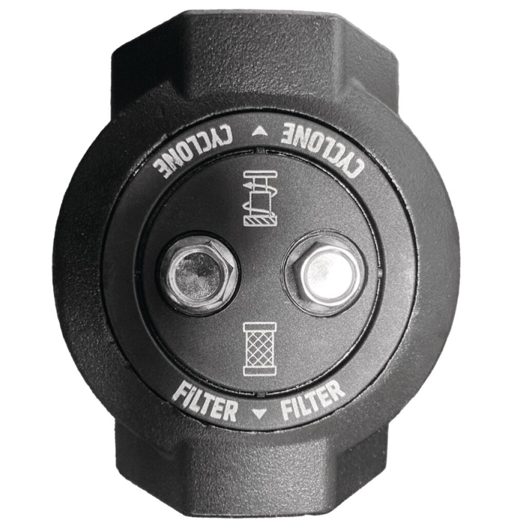 Abscheidung von Kondensat (Wasser, Öl) und Schmutzpartikeln durch zentrifugale Beschleunigung der Druckluft.