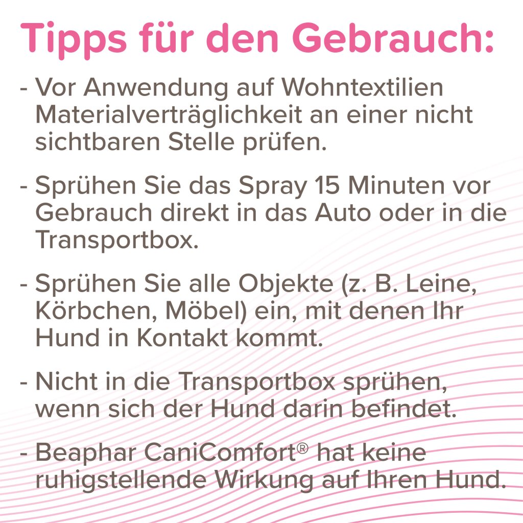 Beaphar CaniComfort® Wohlfühl-Spray sorgt für ein schnelles Wohlbefinden bei Ihrem Hund und eignet sich besonders für den Gebrauch unterwegs wie beispielsweise beim Tierarztbesuch oder auf Reisen z. B. im Auto.