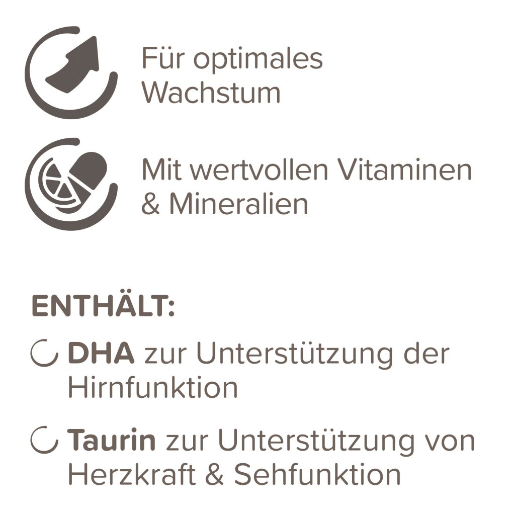 | Zusatzstoffe: | Vitamin AVitamin ECalciumVitamin CBiotinJodZinkSelenEisenTaurinCalcium-D-PantothenatNiacinManganL - LysinDL - MethioninMagnesiumPhosphorKaliumNatriumVitamin B1Vitamin B2Vitamin B6Vitamin B12AntioxidationsmittelVitamin D3Vitamin K3Docosahexaensäure |