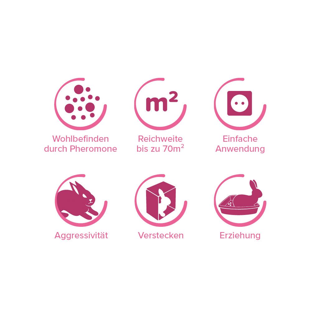 • Enthält die synthetische Nachbildung des vertrauten Kaninchen-Beruhigungspheromons