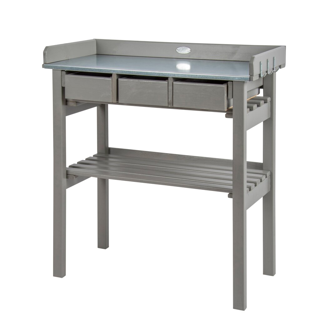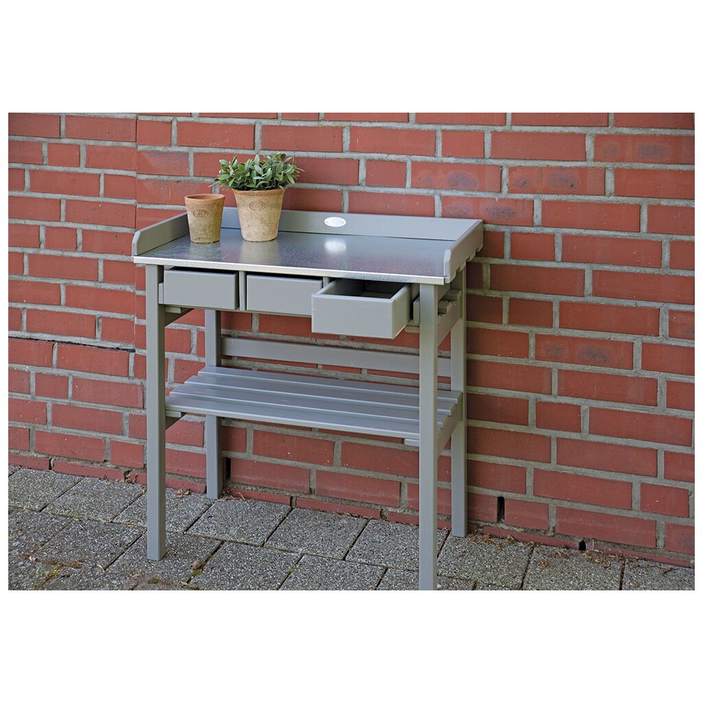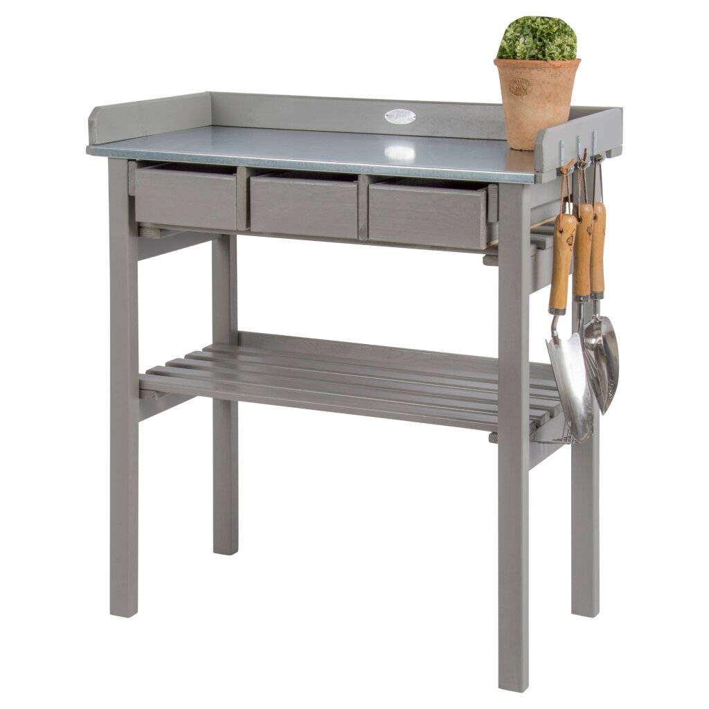 Die robuste Arbeitsfläche aus Zinkblech bietet eine langlebige und pflegeleichte Oberfläche für Umtopfen, Pflanzarbeiten und Gartenpflege.
