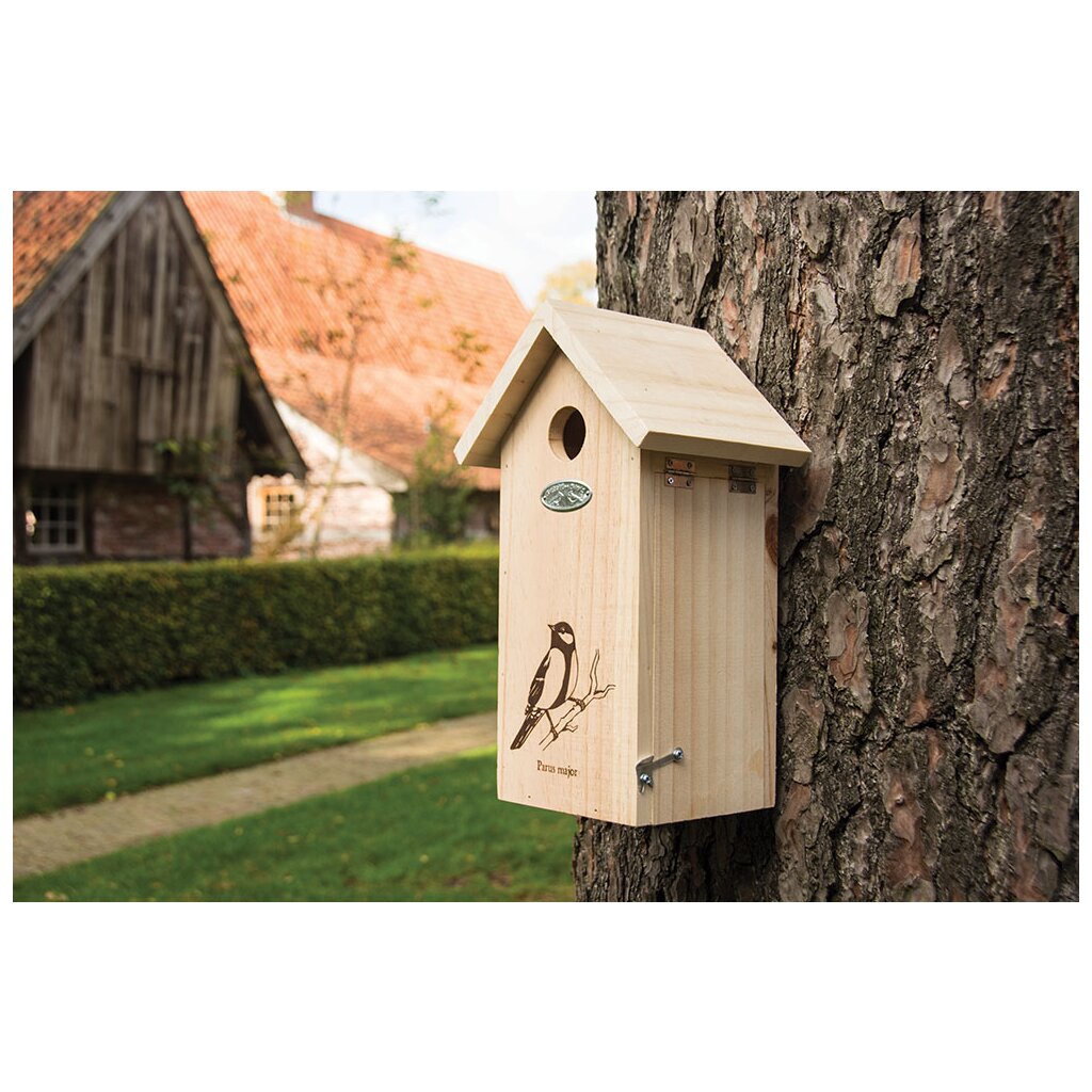 Die eingebrannte Silhouette und der lateinische Name weisen bereits darauf hin, dass dieser Nistkasten für die Kohlmeise bestimmt ist.