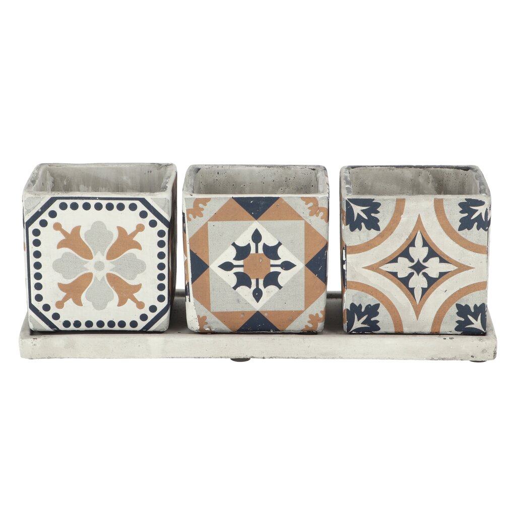 Drei hochwertige Keramiktöpfe mit traditionellem portugiesischem Kachelmuster stehen auf einem passenden Tray – perfekt für Kräuter, kleine Pflanzen oder Blumen.
