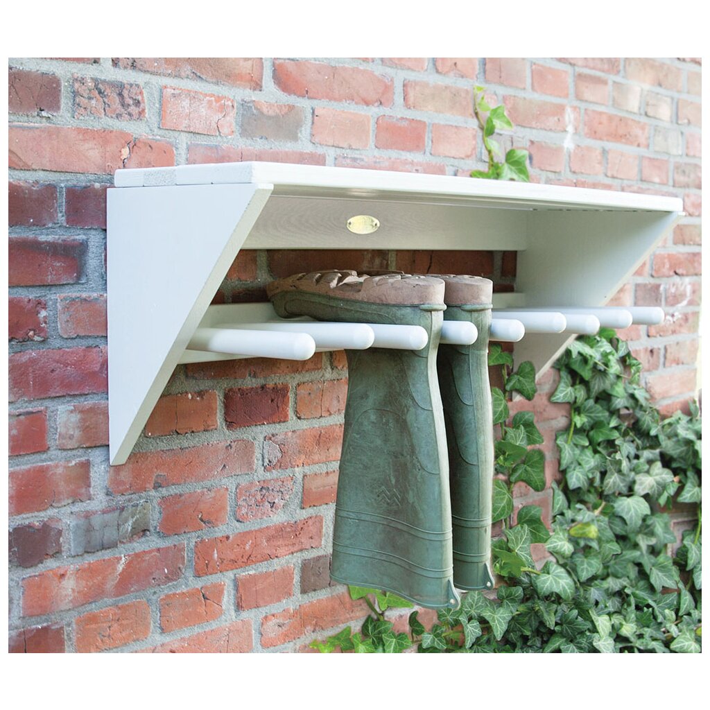 Dieser hölzerne Wandstiefelhalter ist für vier Paar Stiefel geeignet.