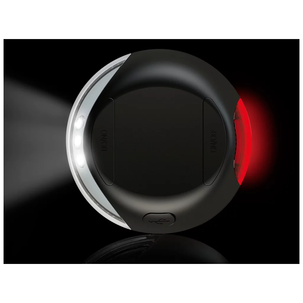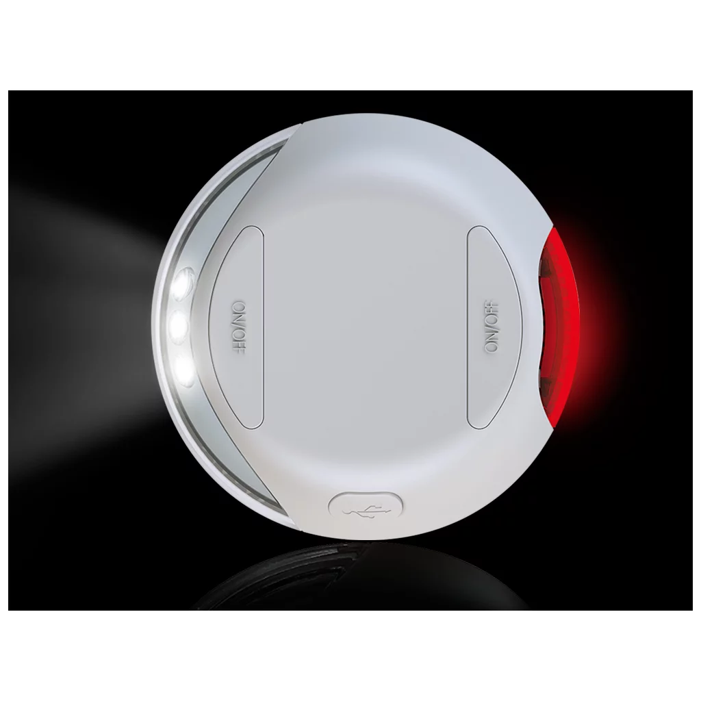 Es besitzt einen Front- und Rückstrahler, die separat einschaltbar sind und lässt sich durch ein Klettsystem einfach an die flexi Leine anbringen.