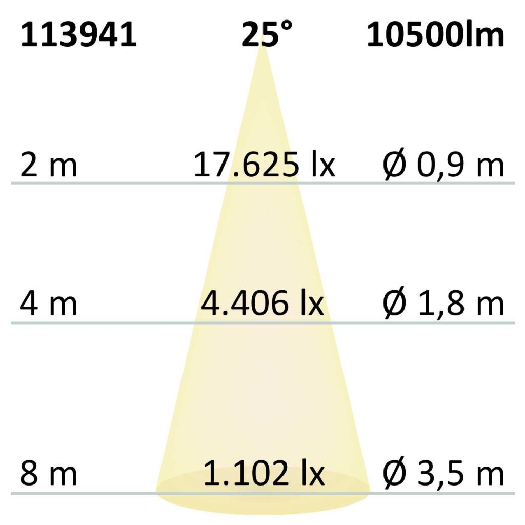 • Besonderheiten 8 polig 2,5qmm (L1, L2, L3, N, PE, Dimm+, -, CHR) inkl. fünf vormontierte und austauschbare Linsenoptiken sowie LED-Platinen mit je 33 Hochleistungchips, Schnellverriegelung zur Befestigung in Balkenaufnahme Art.Nr. 113934/113936