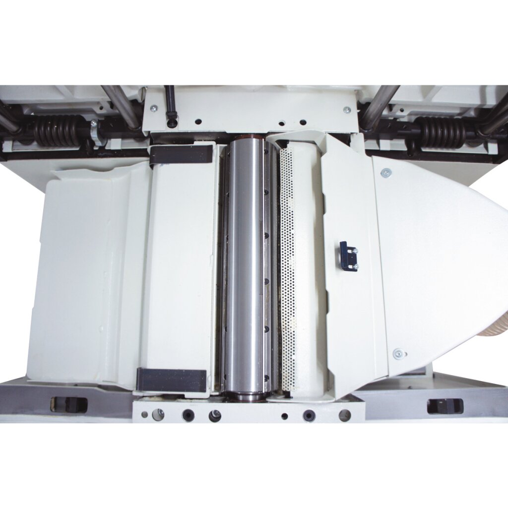 - Schräg verzahnte Stahleinzugswalze für konstanten und gleichmäßigen Materialeinzug, dadurch Spanabnahme bereits ab 0,2 mm (bei min. Werkstückdicke von 3 mm) - ideal für das sparsame Hobeln von Edelholz