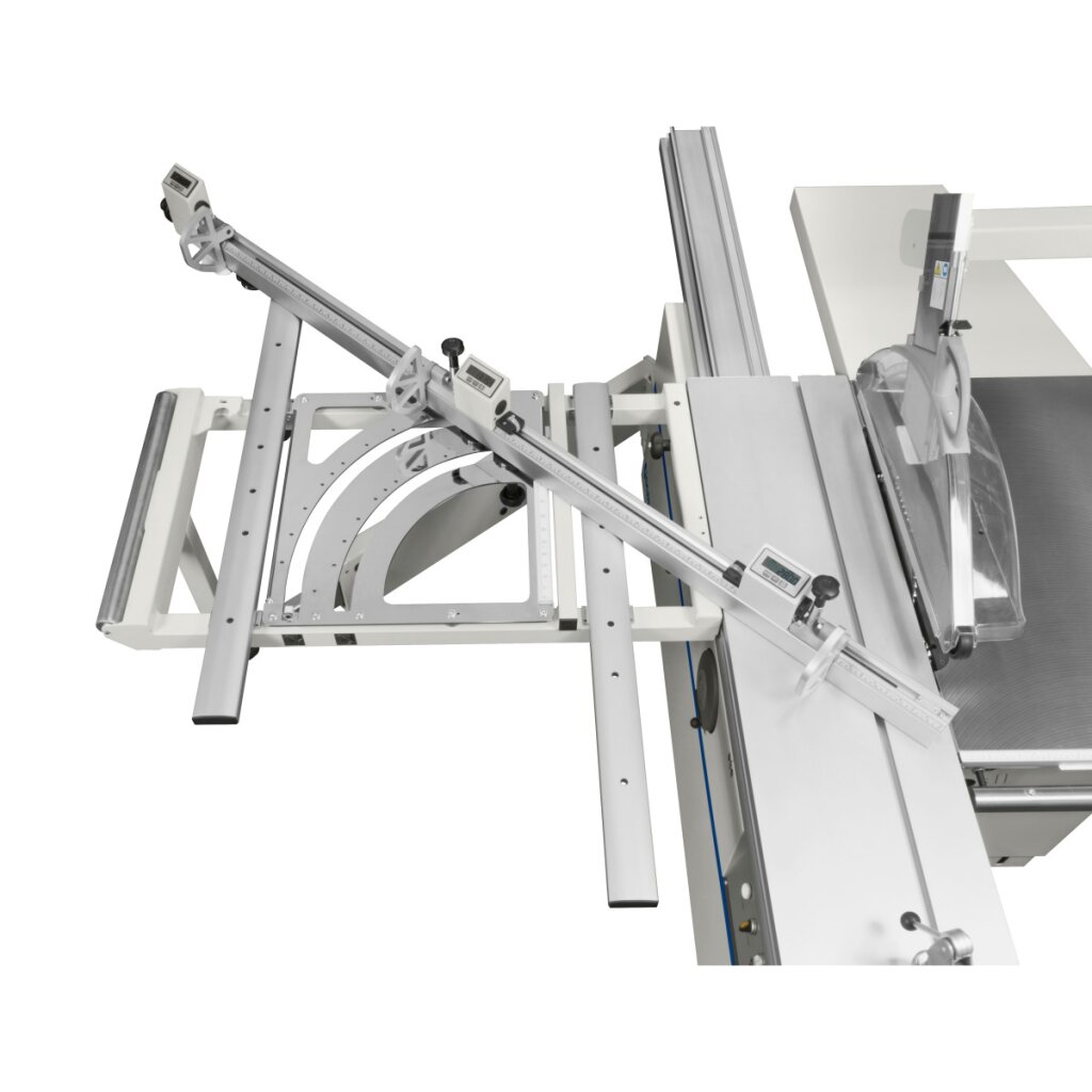 - A 3-Ausführung mit Dreiachsensteuerung zusätzlich mit motorischem Parallelanschlag mit elektronischer Positionierung, Positionsanzeige über einen Encoder, Verstellung über Kugelumlaufspindel, stufenlose Einstellung über Schalter oder automatisches Positionierung und Möglichkeit inkrementaler Verstellung