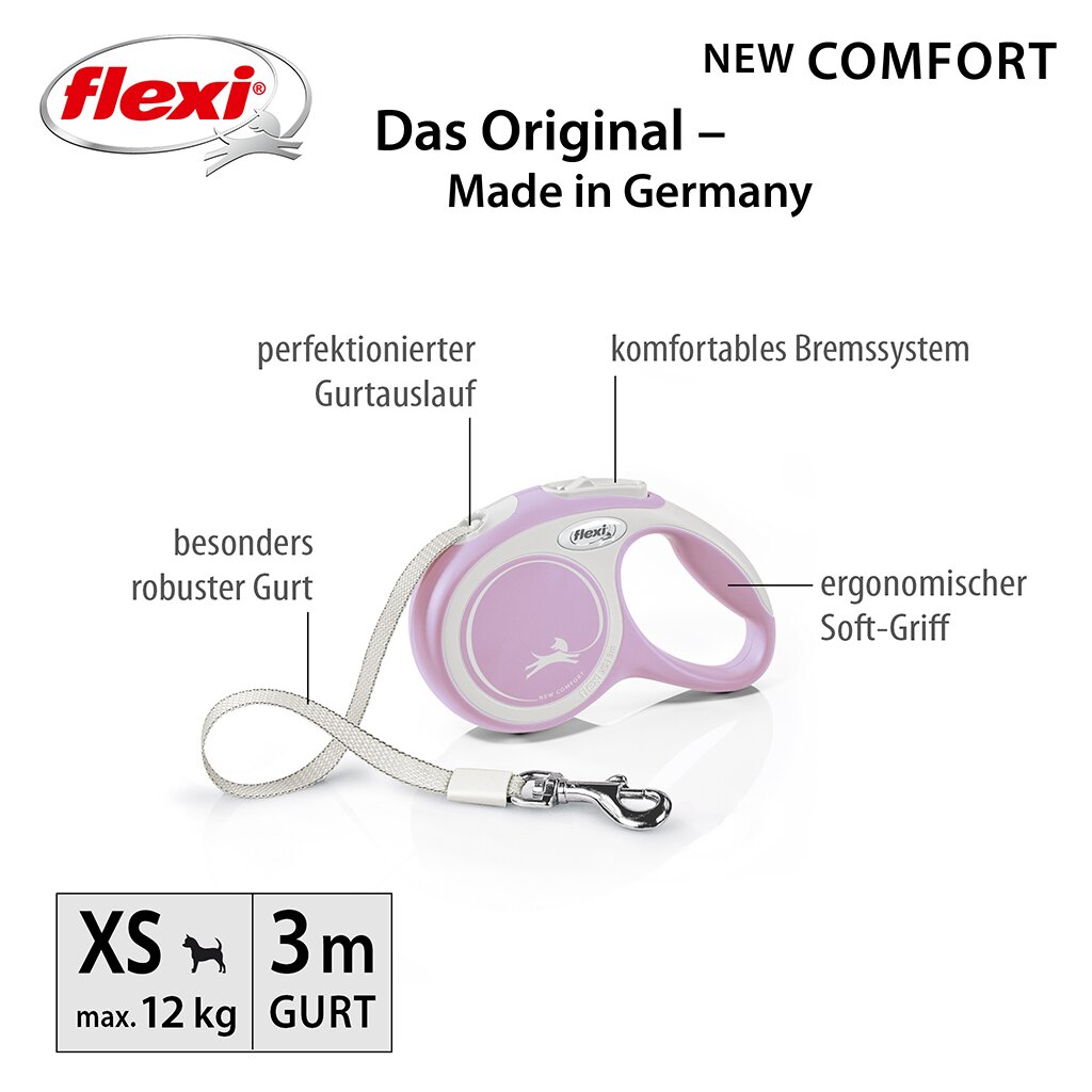 Die Gurt-Roll-Leine flexi New Comfort bietet Flexibilität, Komfort und Sicherheit und passt perfekt in jede Grundausstattung.