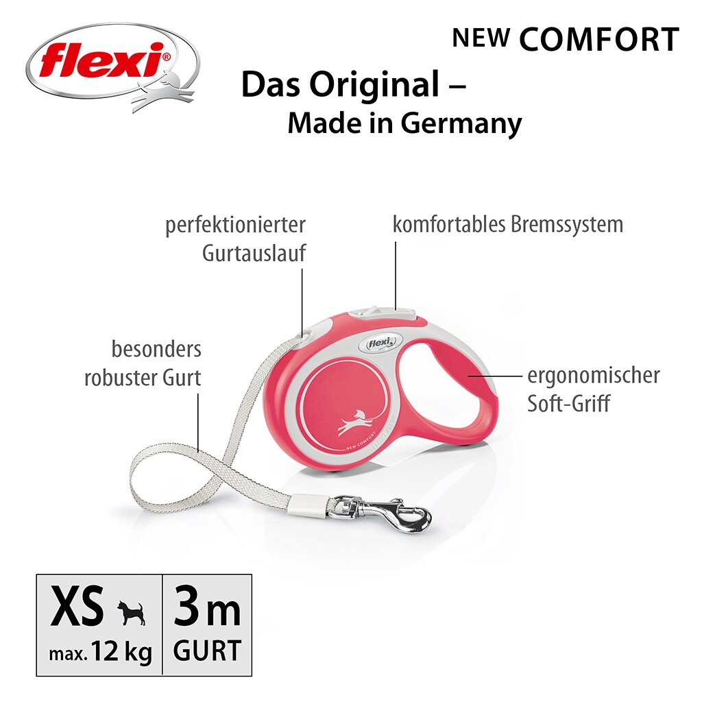 Die Gurt-Roll-Leine flexi New Comfort bietet Flexibilität, Komfort und Sicherheit und passt perfekt in jede Grundausstattung.