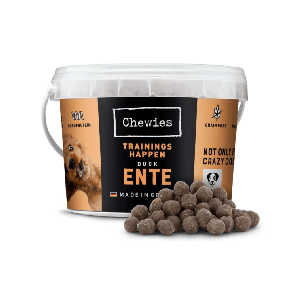 CHEWIES Trainings-Happen Ente sind weiche, aromatische Belohnungssnacks, die sich perfekt für Hundeschule, Alltagstraining und kleine Übungseinheiten eignen.
