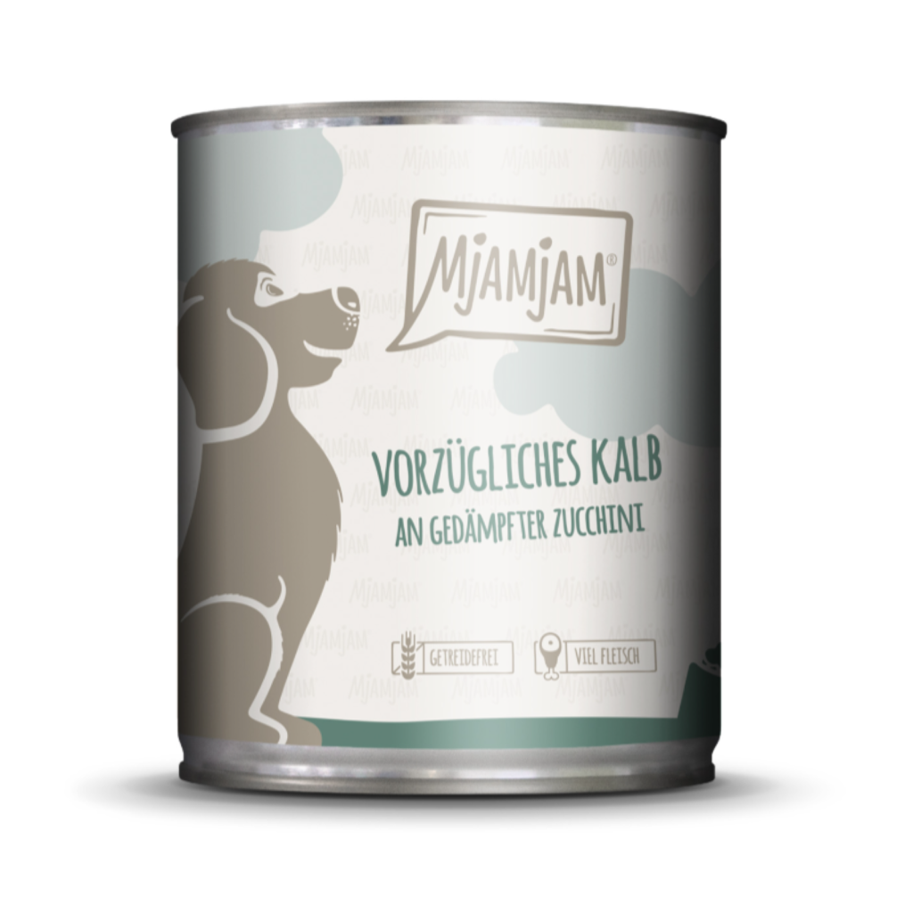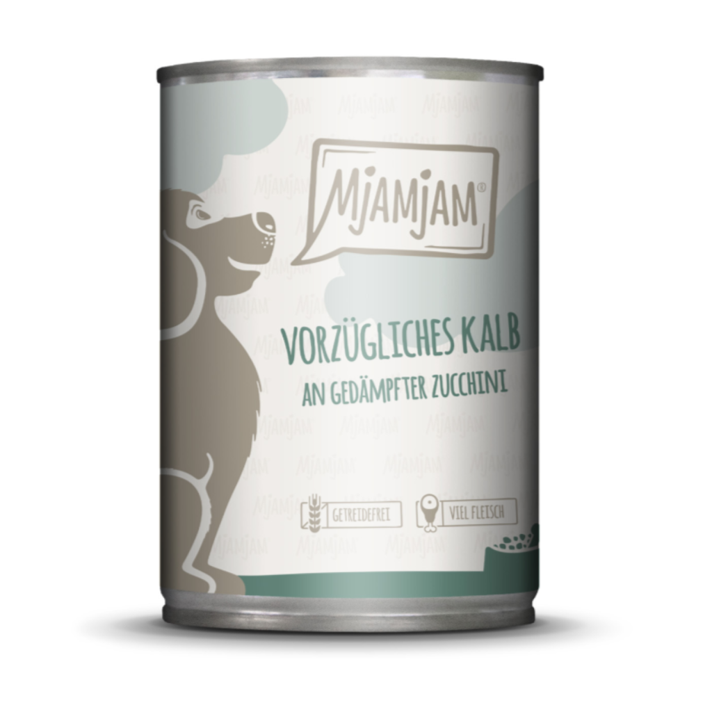 MjAMjAM Adult Vorzügliches Kalb an gedämpfter Zucchini verbindet zartes Kalb mit einer milden, grünen Frische – ein Menü für Hunde, die einen feinen Geschmack und eine klare, alltagstaugliche Rezeptur schätzen.
