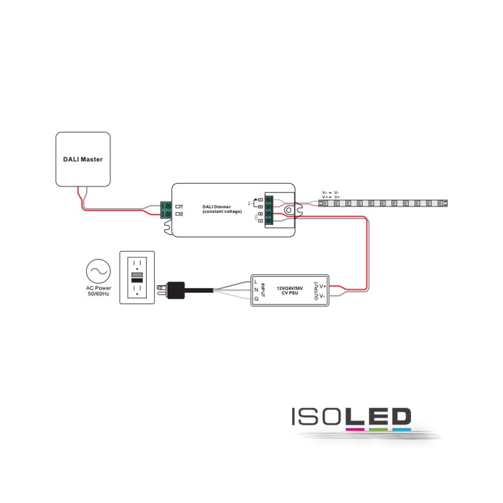 - Besonderheiten: 1-Kanal-Lichtsteuergerät mit 12V-48V DC Konstantspannung am Ausgang und DALI-Schnittstelle für einfarbige LED Stripes oder Leuchtmittel zur Ansteuerung per DALI Bus / Protokoll. Die Ansteuerung erfolgt über die vergebene DALI-Kurzadresse gemäß DALI Standard Protokoll IEC60929