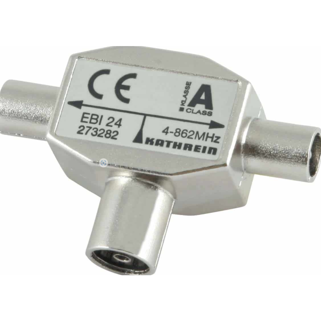 - T-Stecker TV, 4-862 MHz, Eingang: 1 x IEC-Bu, Ausgänge: 2 x IEC-Sti, Verteildämpfung: 3,5 dB, Schirmungsmaß: VHF/UHF > 85/75 dB, Schirmklasse A