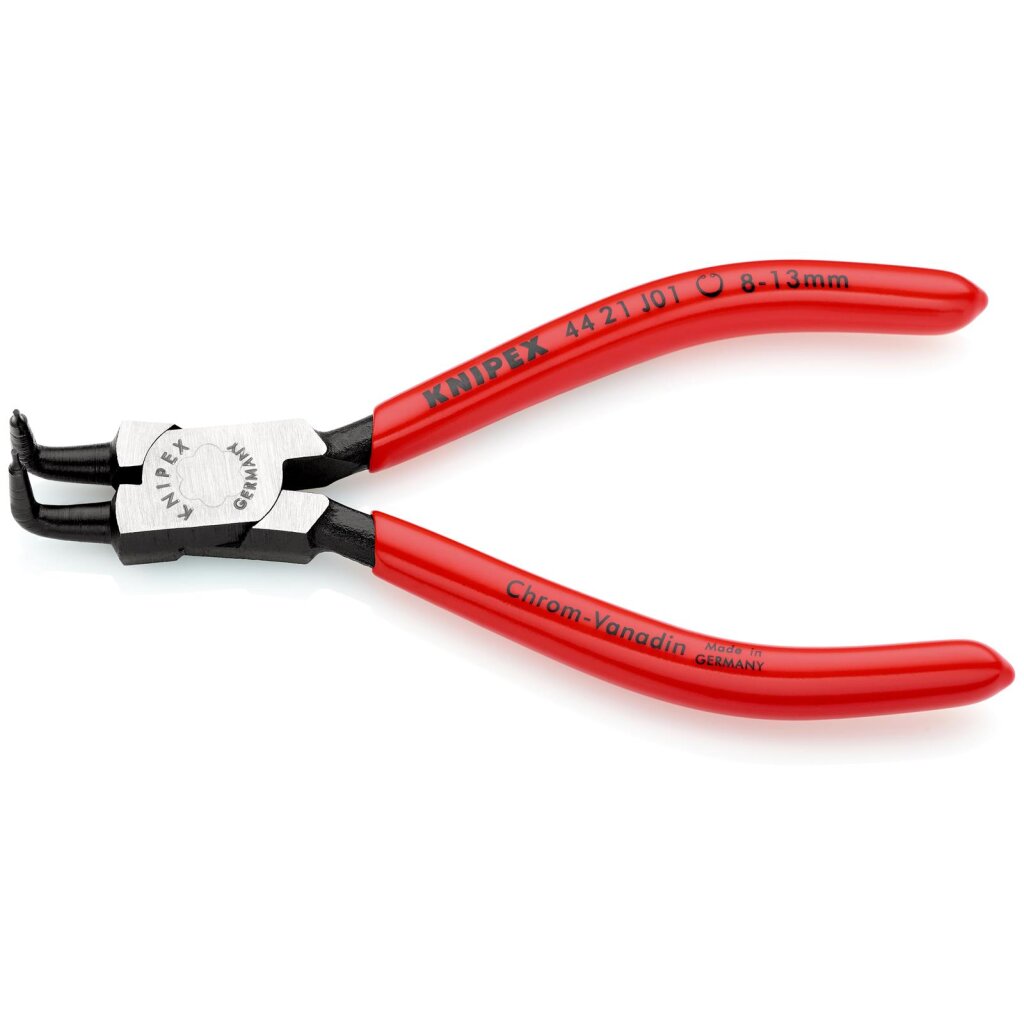 Bei der Arbeit mit Sicherungsringen sind die Spitzen der Sicherungsringzange entscheidend. Diese greifen in die Montagebohrungen der Ringe, welche den Spitzen der Zangen nur wenig Reibungsfläche bieten. Die Spitzen müssen die Überwindung der Ringspannung gewährleisten und den Sicherungsring nach dem Abnehmen bzw. vor dem Einsetzen sicher halten. Diese hohen Anforderungen an Genauigkeit und Stabilität der Zangenspitzen werden von der Knipex 44 21 J01 erfüllt. Zangenschenkel und -spitzen sind in einem Stück geschmiedet. Dies führt zu einer entsprechend hohen Haltbarkeit. Die Spitzen sind außerdem sehr präzise gefertigt, überdreht und leicht nach innen geneigt, wodurch die Sicherungsringe daran gehindert werden, von den Spitzen abzuspringen.