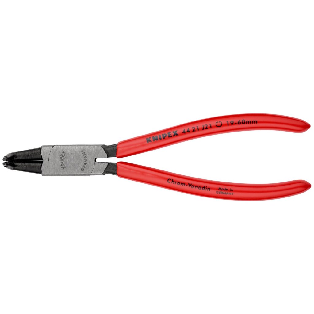 Bei der Knipex 44 21 J21 werden Zangenschenkel und -spitzen in einem Stück geschmiedet. Das führt zu einer entsprechend hohen Haltbarkeit. Die sehr präzise überdrehten Spitzen sind außerdem leicht nach innen geneigt gefertigt. Dadurch werden die Sicherungsringe fest auf den Zangenspitzen gehalten.