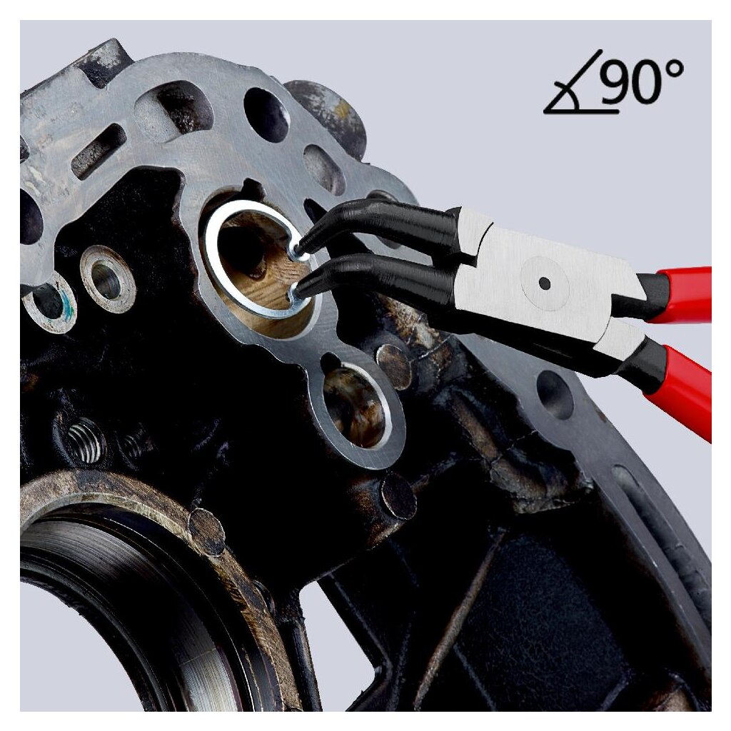 Eine zuverlässige Sicherungsringzange wie die Knipex 44 21 J21 ist eine spürbare Arbeitserleichterung. Sie ist vorne schlank und für optimale Zugänglichkeit auch schwer zugänglicher Sicherungsringe um 90° abgewinkelt. Die Zange liegt gut in der Hand, lässt sich treffsicher und präzise in den Montagebohrungen der Sicherungsringe ansetzen und hält die Ringe zuverlässig. Die Arbeit mit einer erstklassigen Sicherungsringzange wie der Knipex 44 21 J21 spart viel Zeit. Das weiß jeder, der schon einmal versucht hat, einen verdeckt liegenden Sicherungsring mit Behelfswerkzeugen aus einer Bohrung herauszubekommen und dabei um die Ecke zu arbeiten. Viel Zeit kosten kann es auch, wenn man einen weggesprungenen Ring in der Werkstatt suchen muss, weil ihn die Spitzen einer weniger gut verarbeiteten Sicherungsringzange nicht gut gehalten haben. Mit der Knipex 44 21 J21 sitzen jeder Sicherungsring und jeder Handgriff.