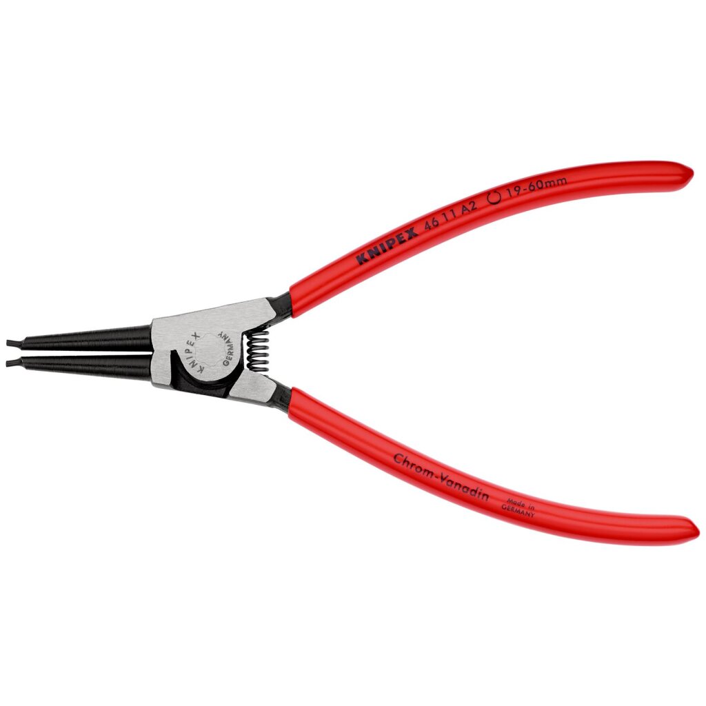 Bei Montage und Demontage von Sicherungsringen sind zwei Zangeneigenschaften wichtig: Der Anwender möchte die Ringspannung mühelos überwinden können; gleichzeitig will er sicher sein, die Sicherungsringe nicht zu überdehnen, weil sie dadurch ihre Funktion verlieren würden. Es geht also darum, die Handkraft sowohl präzise als auch gut dosierbar zum Werkstück zu bringen. Die Sicherungsringzange Knipex 46 11 A2 bietet hierfür die Idealbedingungen. Sie hat ein hochwertig verarbeitetes, präzises Gelenk und stabile Zangenspitzen. Dank ausgewogener Werkzeuggeometrie und so gut wie reibungsfreier Kraftübertragung im Präzisionsgelenk kommt die Handkraft wohldosiert an den Sicherungsringen an. Handschonend und präzise können die Sicherungsringe gegriffen und gehalten werden. Die integrierte Öffnungsfeder unterstützt den Anwender beim Öffnen der Zange.