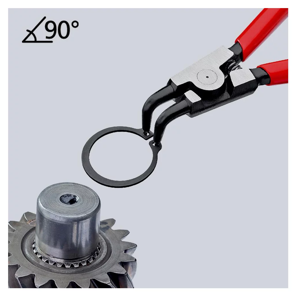 Die Sicherungsringzange Knipex 46 21 A21 ist ein zuverlässiges, professionelles Werkzeug. Sie entlastet die Hände des Anwenders. Sie erhöht die Sicherheit von Maschinen und anderen technischen Vorrichtungen, an denen Sicherungsringe verwendet werden. Sie spart eine Menge Zeit, denn wer bei einem Sicherungsring nur einmal anzusetzen braucht, um ihn sicher zu montieren, ist klar im Vorteil. Das weiß jeder, der schon einmal mit einer weniger gut verarbeiteten Sicherungsringzange gearbeitet hat und z. B. einen von der Zange abgesprungenen Sicherungsring suchen musste. Mit der Knipex 46 21 A21 sitzt jeder Handgriff – und die Sicherungsringe halten, was sie halten müssen. Bei der Knipex 46 21 A21 ist der Zangenkopf um 90° abgewinkelt. Dank dieser Bauweise können Sicherungsringe auch dann gut erreicht werden, wenn ein Bauteil im Weg ist und ein senkrechter Zugang zum Sicherungsring nicht möglich wäre.