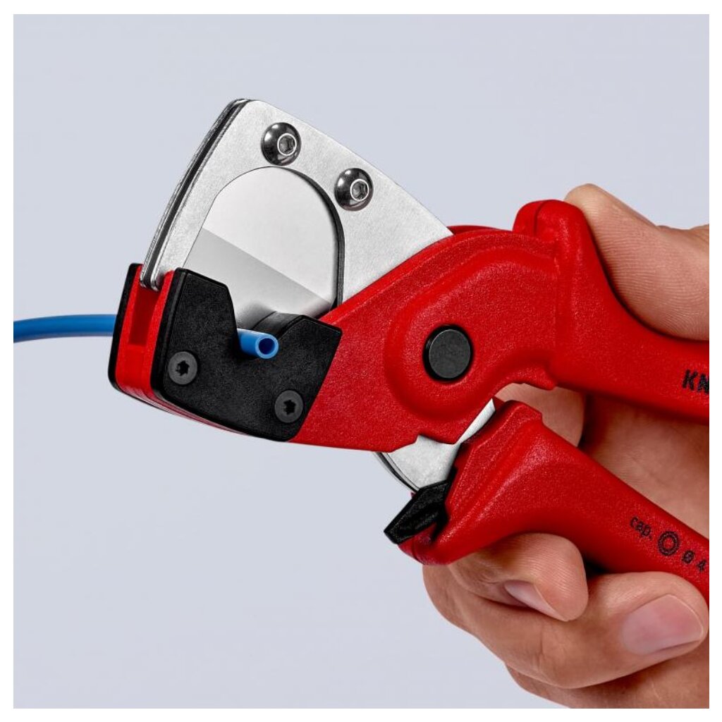 Durch die exakte Positionierung des Schnittguts in der Schlauch- und Schutzrohrschere und das keilförmige Messer ergeben sich mit dem Rohrschneider Knipex PlastiCut® automatisch rechtwinklige Schnitte.