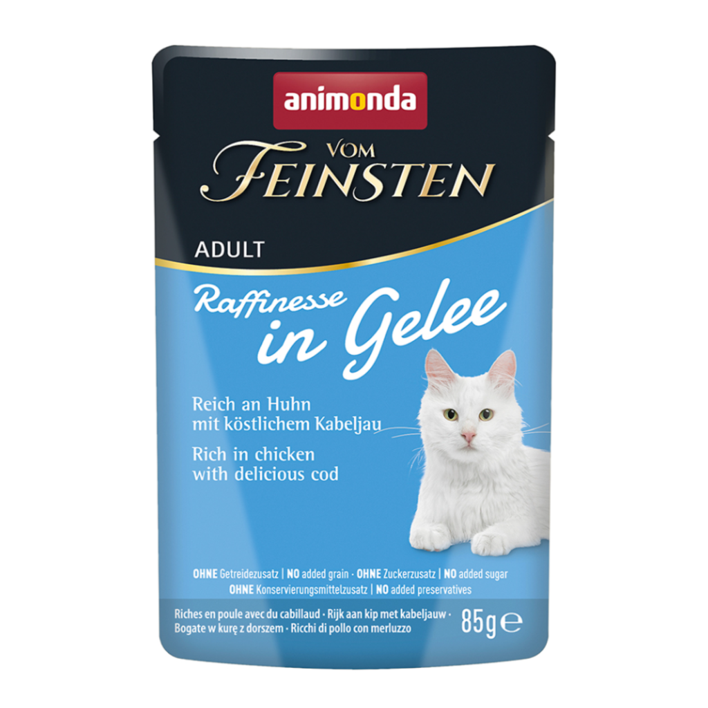 Vom Feinsten Raffinesse in Gelee Adult (Huhn + Kabeljau, 85 g) bietet ein raffiniertes Genusserlebnis für ausgewachsene Katzen.
