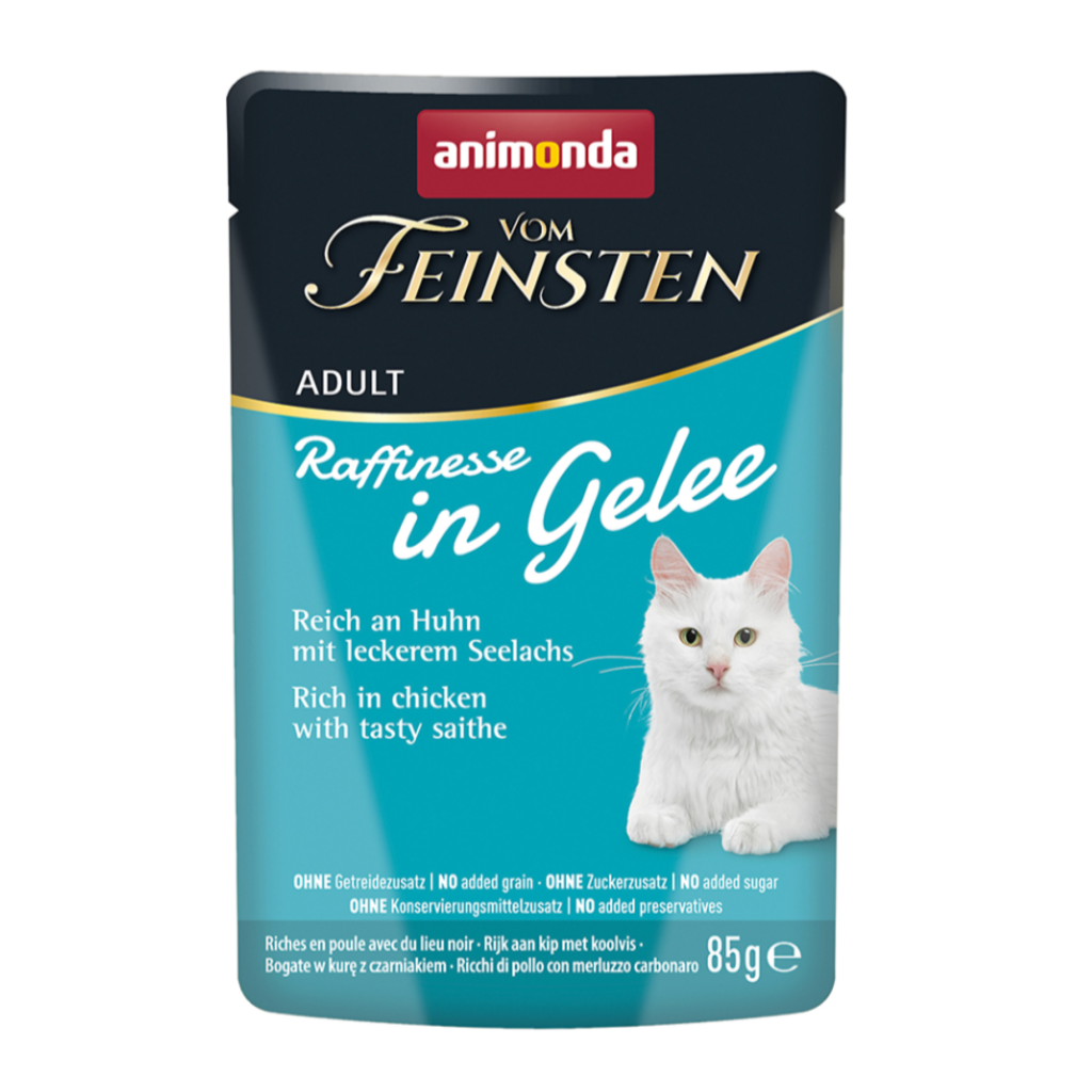 Vom Feinsten Raffinesse in Gelee Adult (Huhn + Seelachs, 85 g) bietet ein raffiniertes Genusserlebnis für ausgewachsene Katzen.