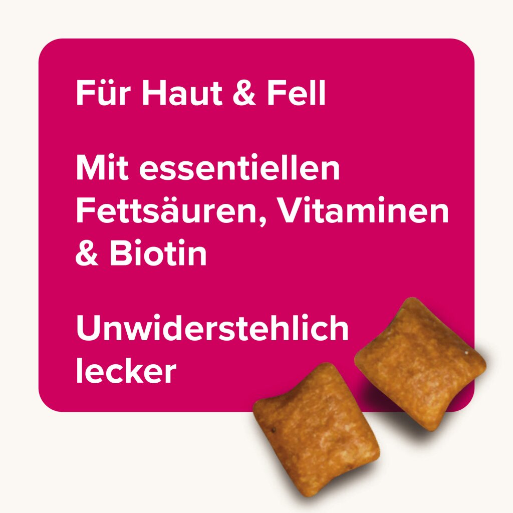 Die „köstlichen Katzenkissen" enthalten wichtiges Biotin zur Unterstützung des Haut- und Haarstoffwechsels und Omega 6 zur Förderung der Fellqualität des Stubentigers.