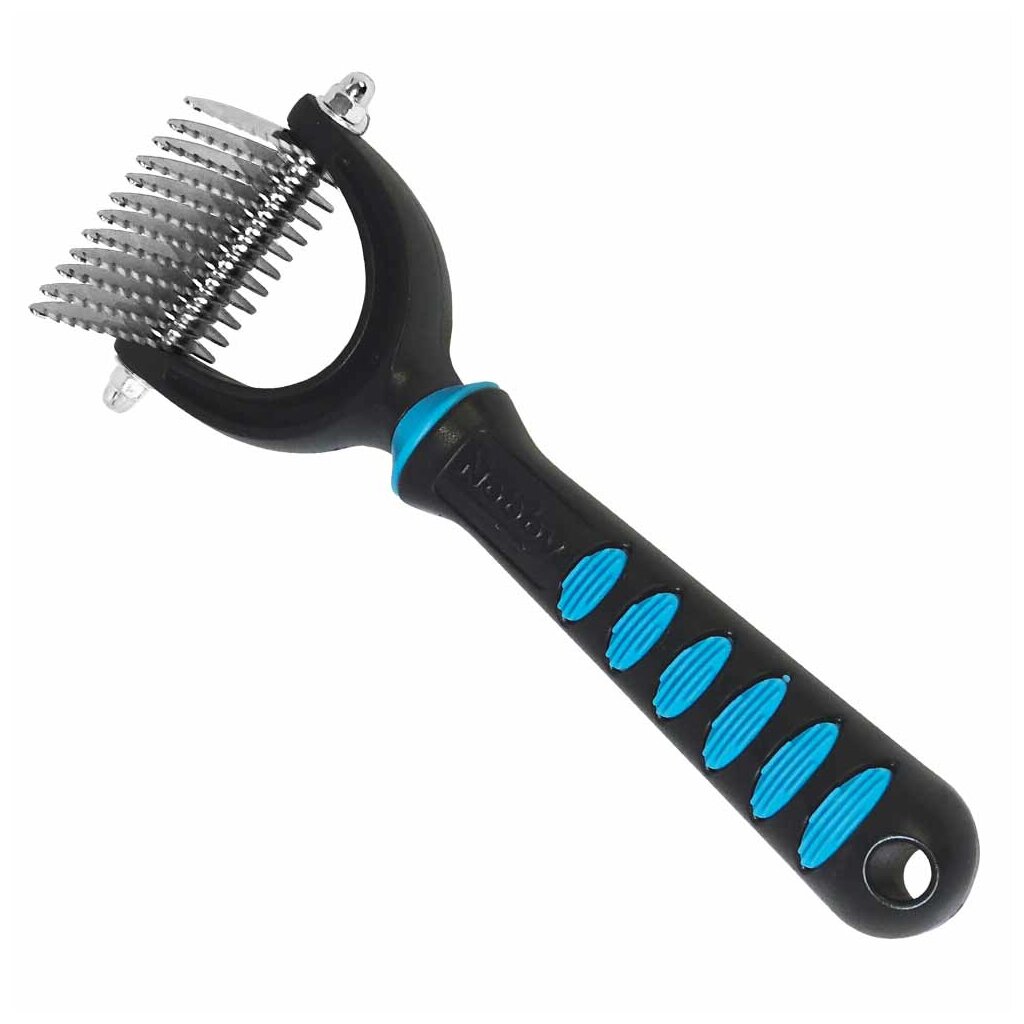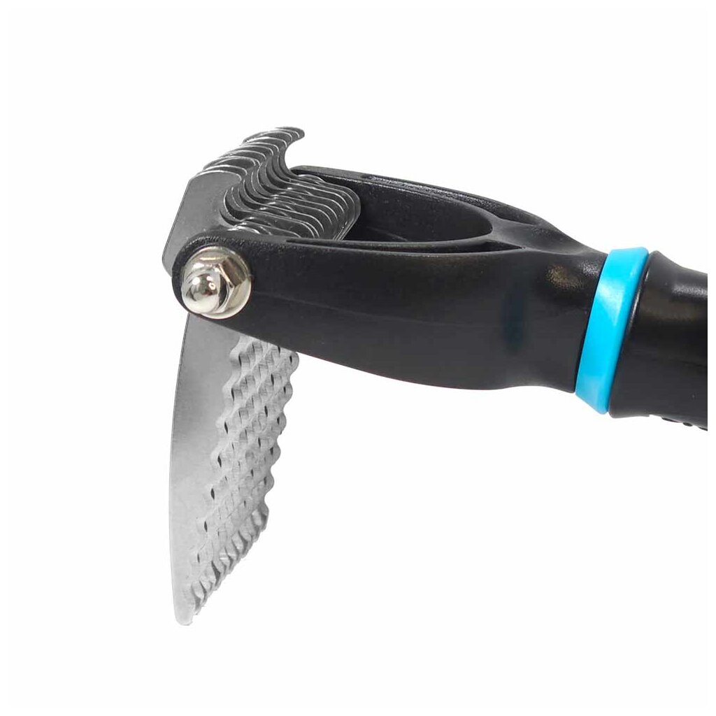 Zwölf abgerundete lange und kurze Klingen sorgen dafür, dass auch hartnäckige Knoten, starke Verfilzungen und die Unterwolle schonend entfernt werden, ohne das Deckhaar zu beschädigen.