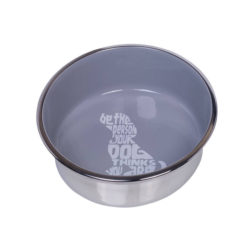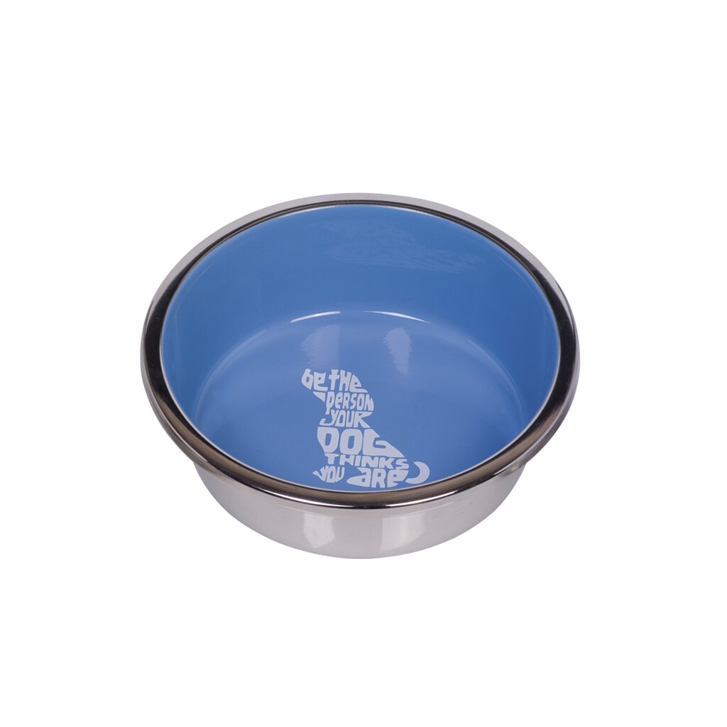 Der Edelstahlnapf "Wise" ist von innen farbig lackiert und mit einem Schriftzug in Hundeform versehen.