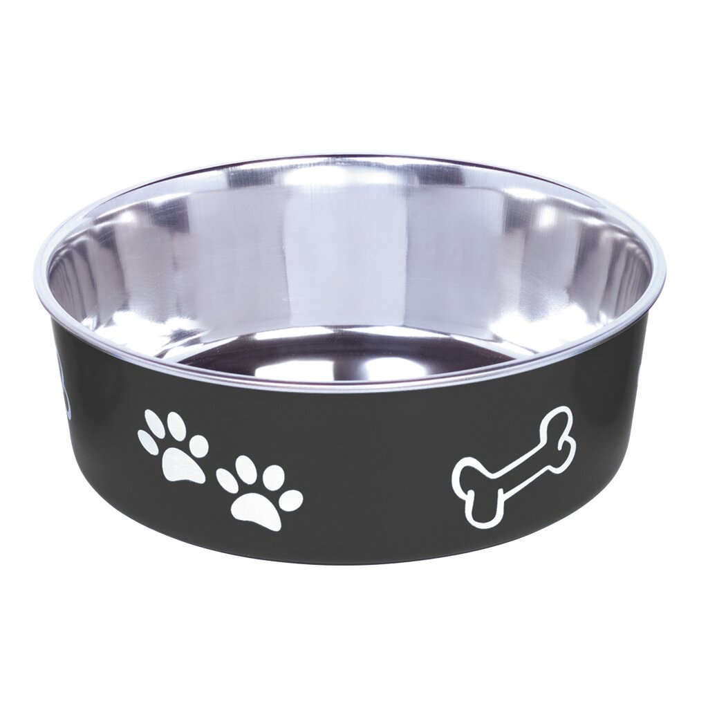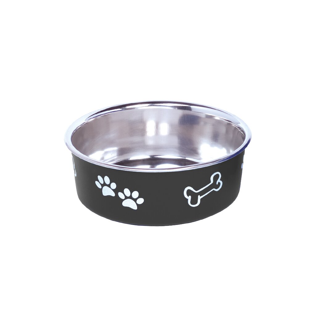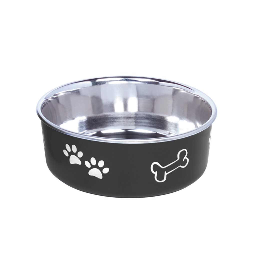 Der Hundenapf "Fusion" aus Edelstahl und Kunststoff ist mit Pfoten- und Knochenmotiven versehen.