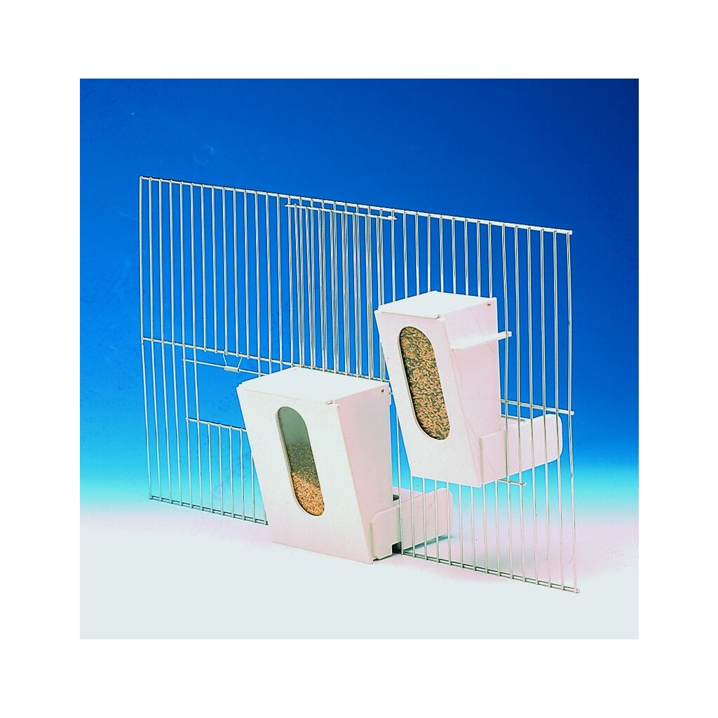 Dieser Futterautomat aus Kunststoff ist einsetzbar bei Vorsatzgittern mit Falltür.
