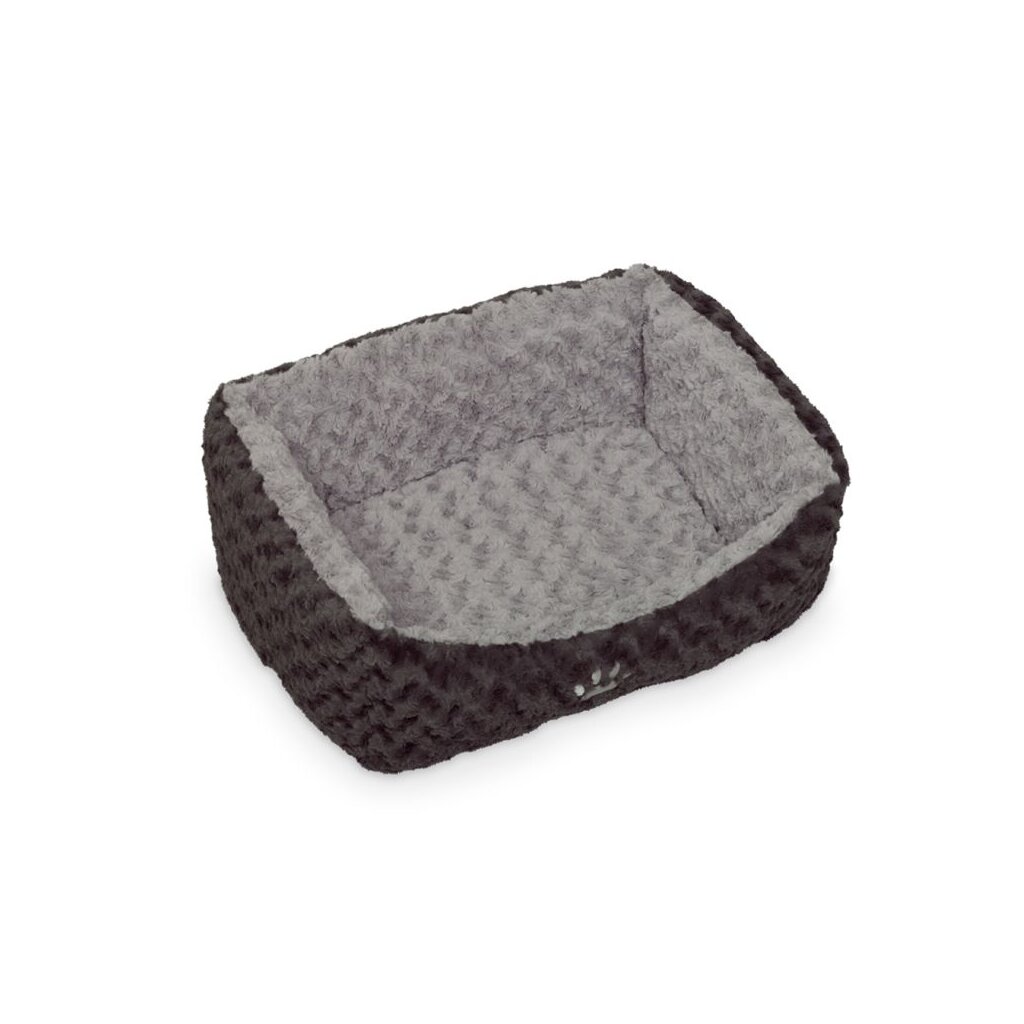 Das eckige Komfortbett "Seoli" besteht aus besonders weichem Softplüsch (100% Mikrofaser), außen dunkelgrau, innen hellgrau.