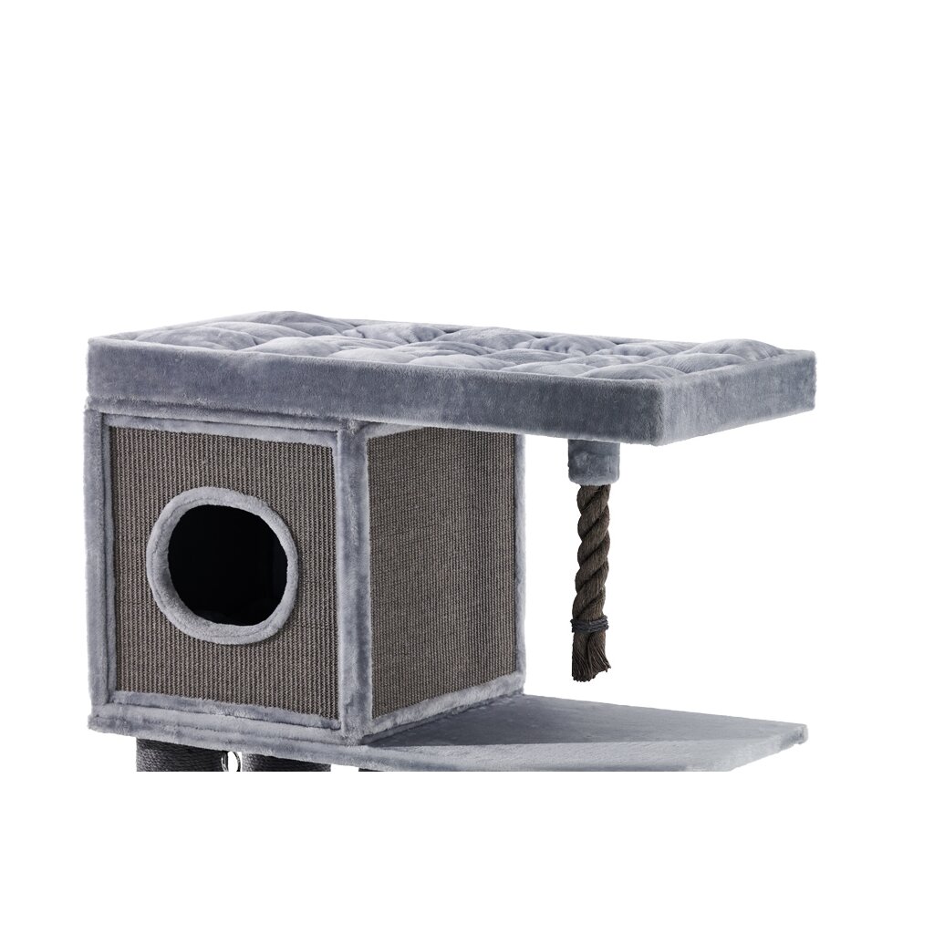 Der Kratzbaum ist mit zwei Höhlen, einer Hängematte und vielen weiteren Liegeflächen ausgestattet.