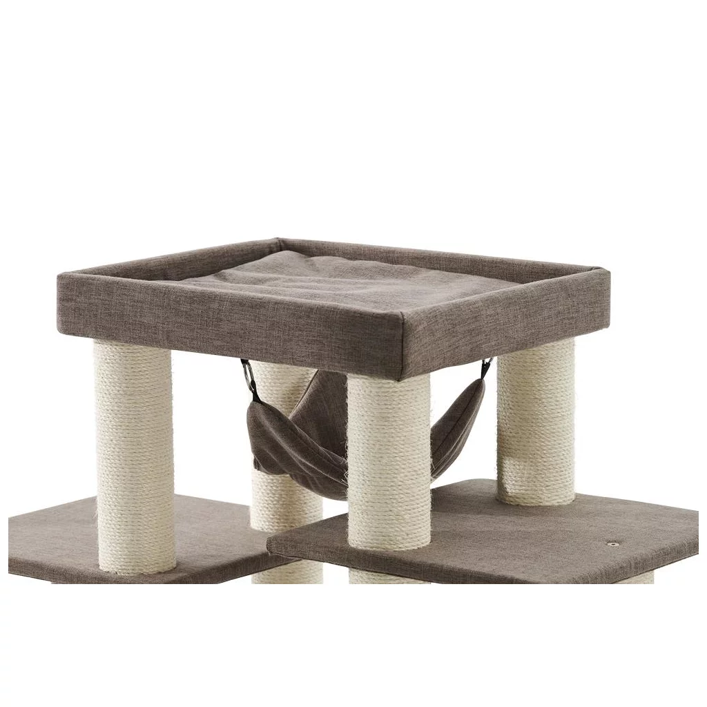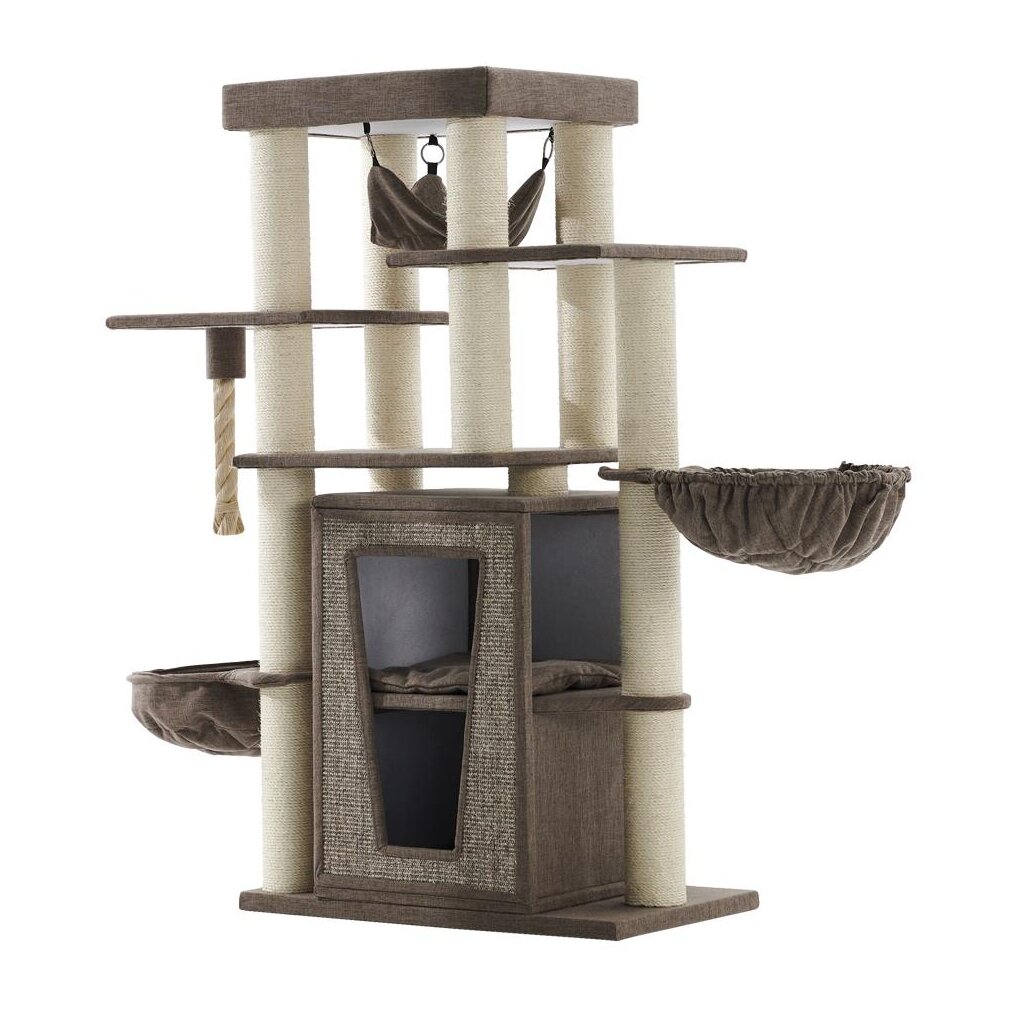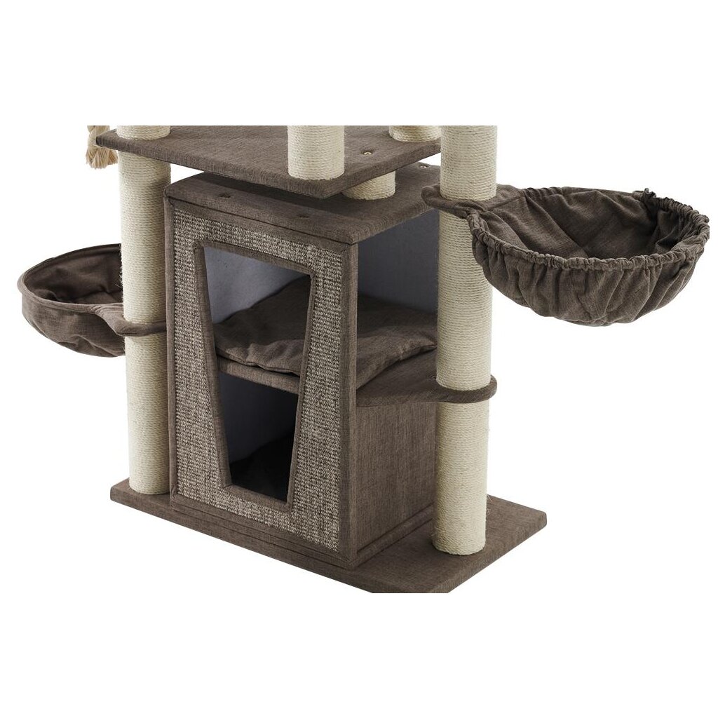 Der Kratzbaum ist mit einer großen Höhle mit zwei Ebenen, zwei Liegemulden, einer Hängematte und vielen weiteren Liegeflächen ausgestattet.