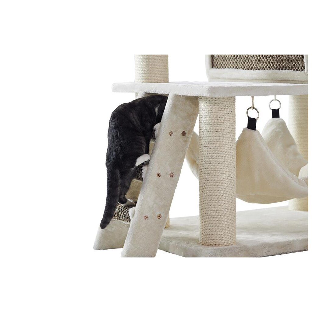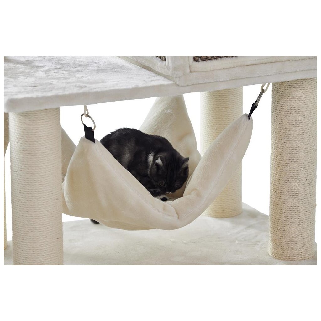 Sein schlichtes Design macht den Kratzbaum nicht nur zu einem idealen Spiel- und Schlafplatz für Ihre Katzen, sondern auch zu einem dekorativen Einrichtungsgegenstand. Kuschelige Liegemulden, eine große Platte mit Kissen, eine Höhle und Hängematten bieten gemütliche Rückzugsmöglichkeiten auch für große und schwere Katzen.