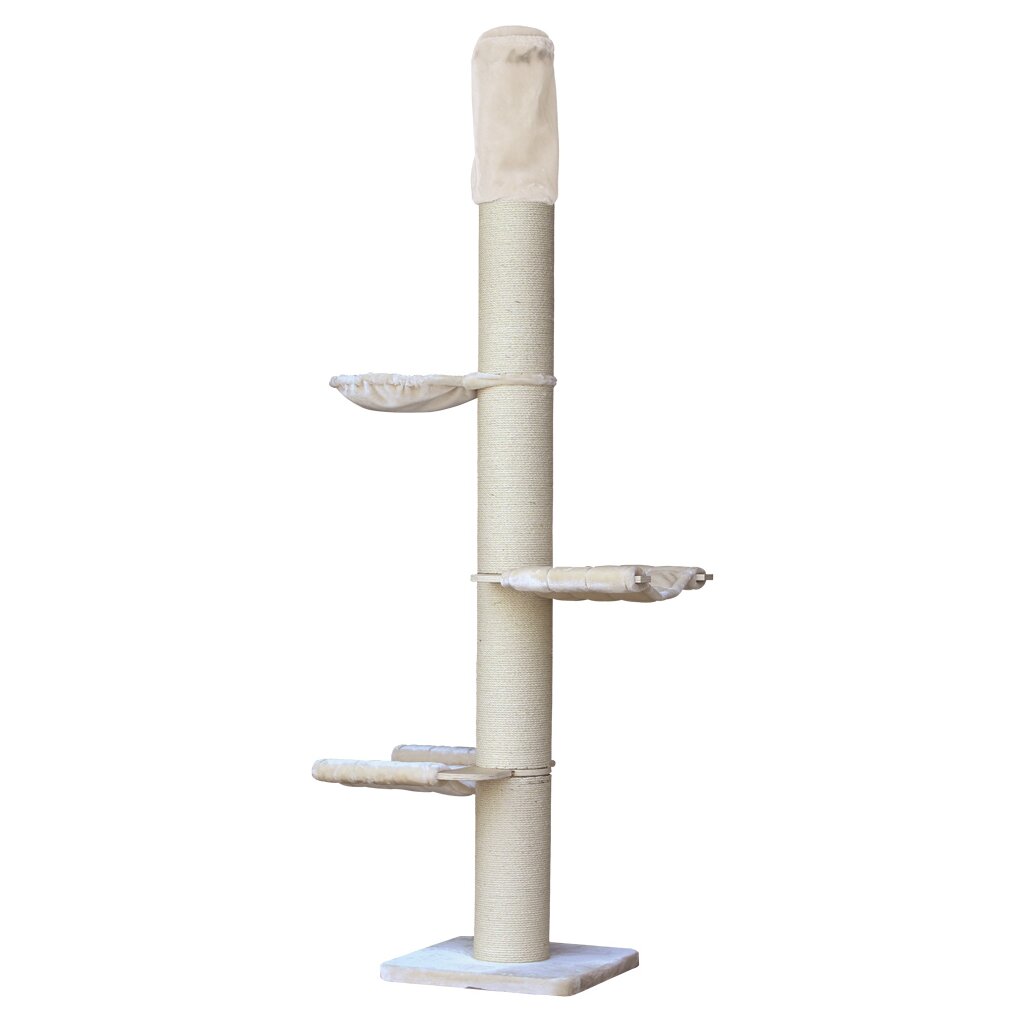 Der Kratzbaum "Kalin" steht auf einer Grundfläche von 60 x 60 cm und ist zwischen 235 und 265 cm höhenverstellbar.