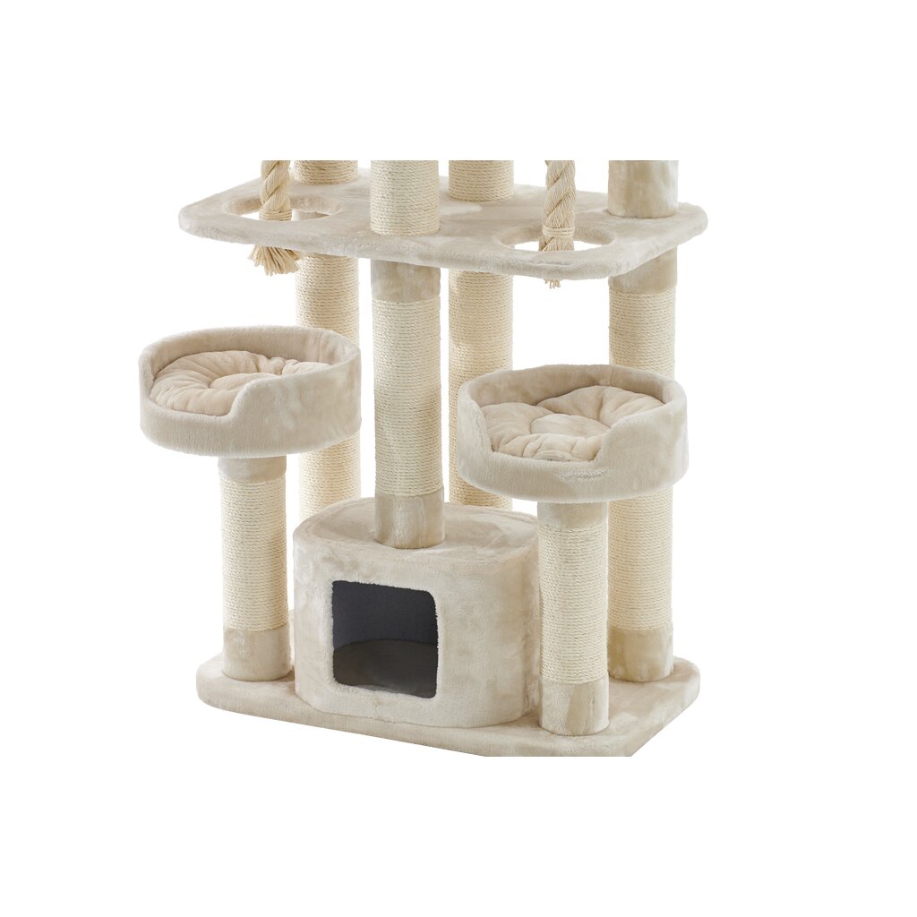 Der Kratzbaum ist mit zwei Höhlen, einer Liegemulde und vielen weiteren Liegeflächen ausgestattet.