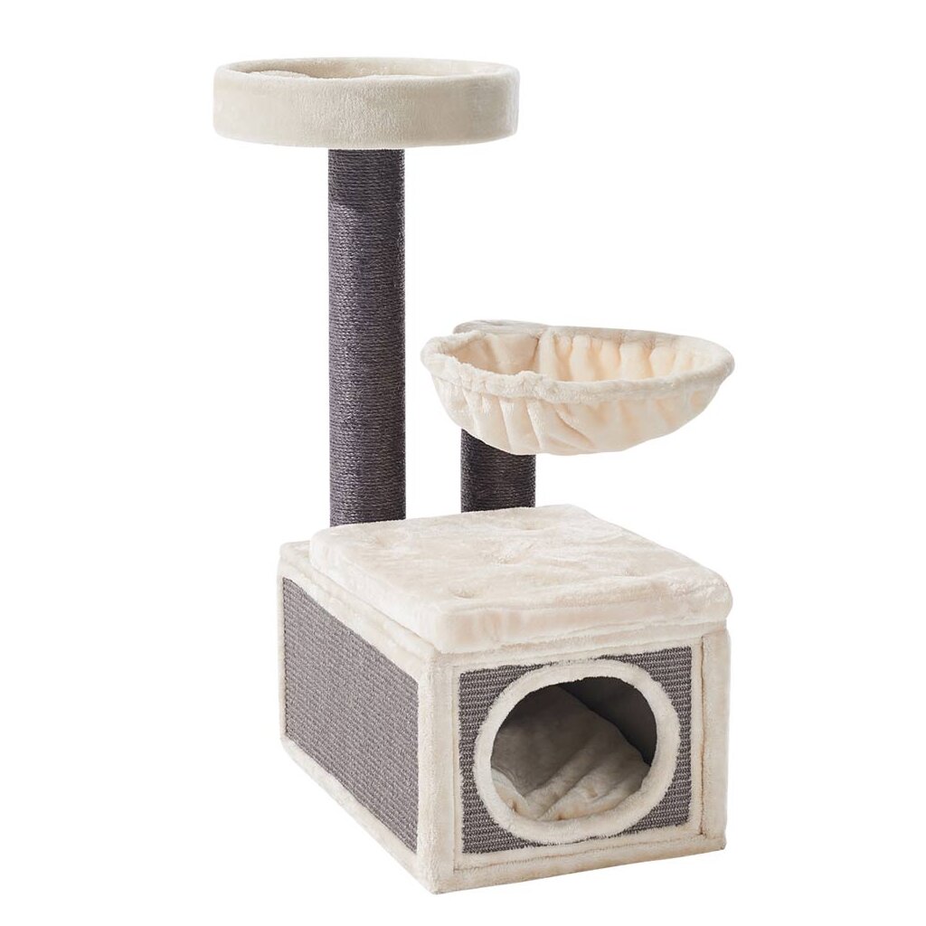 Er ist ausgestattet mit Ø 11 cm Sisalstämmen sowie einer Bodenhöhle, ein darüber hängenden Mulde und einer kreisrunden Liegefläche mit Rand.