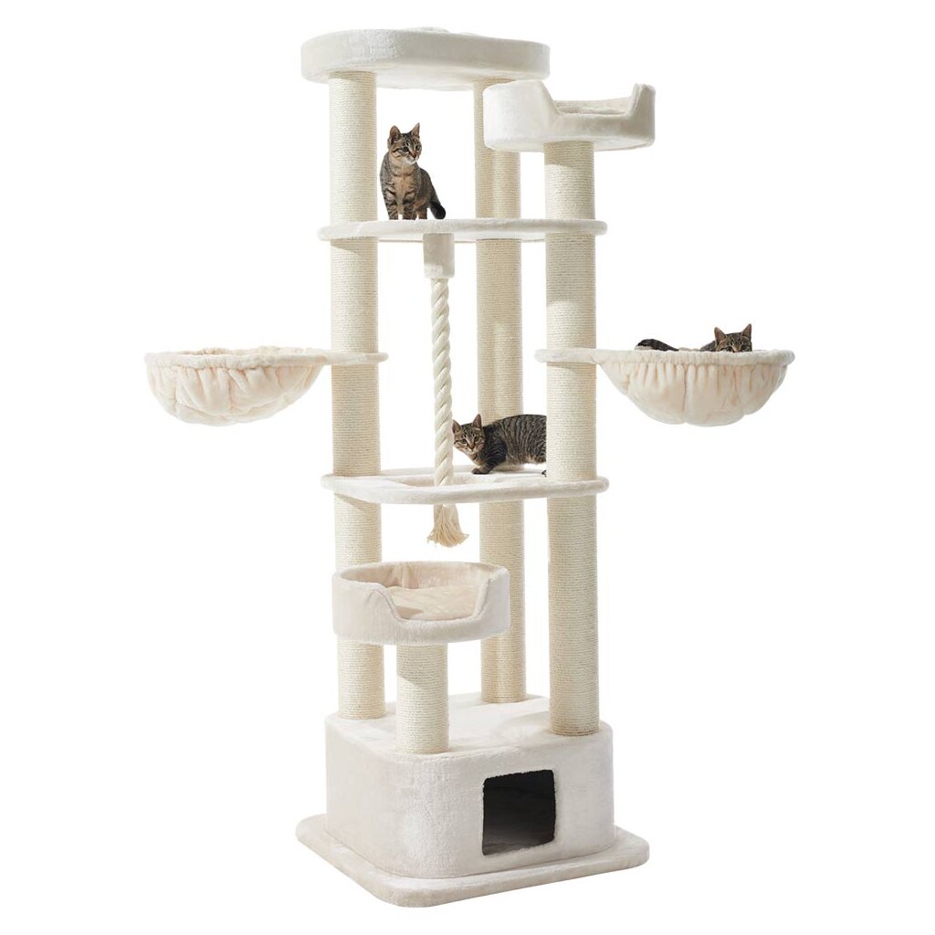 Der Kratzbaum ist mit einer Höhle, zwei Liegemulden und vielen weiteren Liegeflächen ausgestattet.