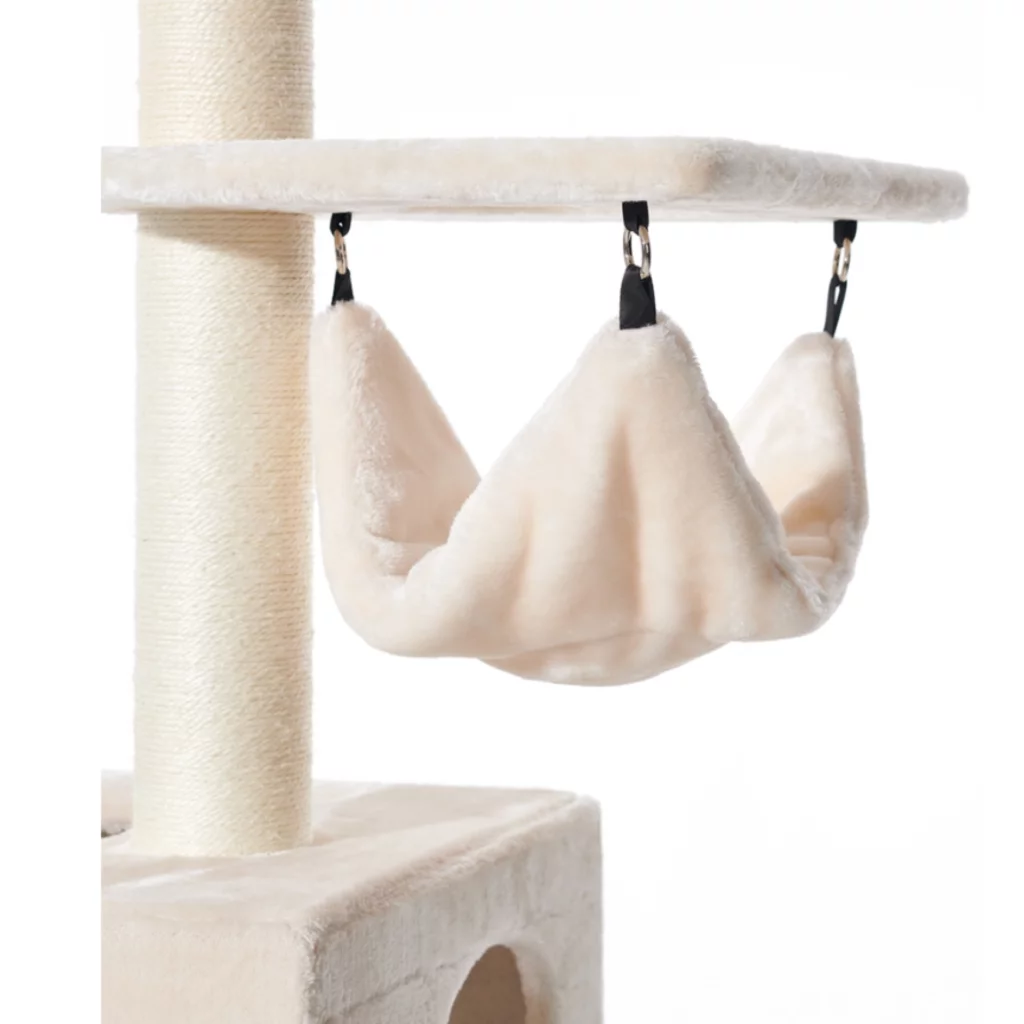 Mit einem Seitenteil in Form einer Treppe mit 2 runden und 1 flachen Stufe, einer gemütlichen Hängematte und einer bequemen Liegemulde ist dieser Kratzbaum der ideale Ort zum Spielen, Entspannen und Ausruhen.