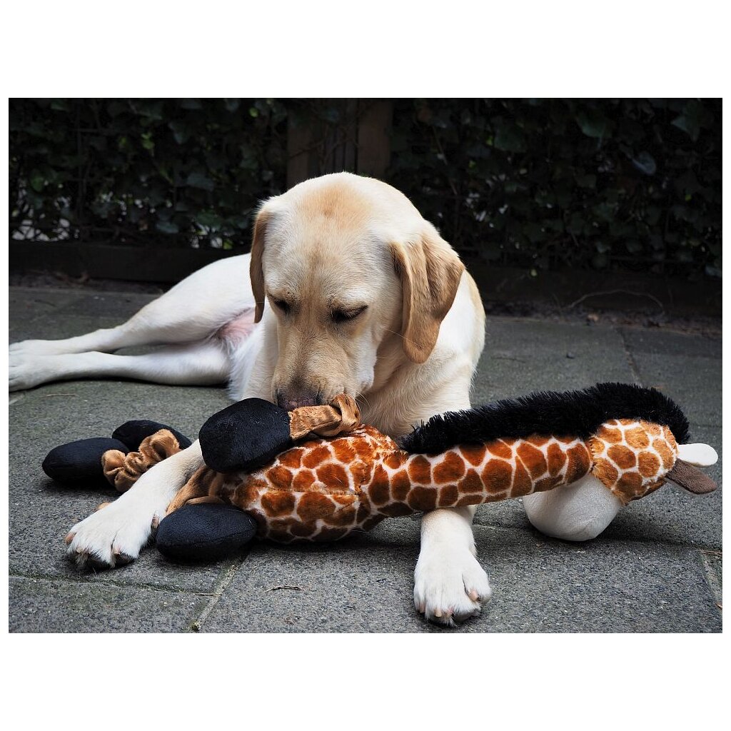 Diese süße Plüschgiraffe überrascht mit Quietsch-Geräuschen, wenn man sie drückt, was gerade neugierige, aktive Hunde begeistert.