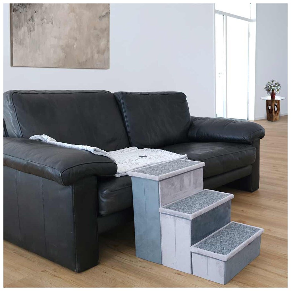 Der Bezug aus samtähnlichem Stoff sorgt für angenehmen Komfort, während die teppichbezogene Lauffläche zuverlässige Trittsicherheit bietet. So behalten Hunde und Katzen auch bei vorsichtigen Bewegungen sicheren Halt.