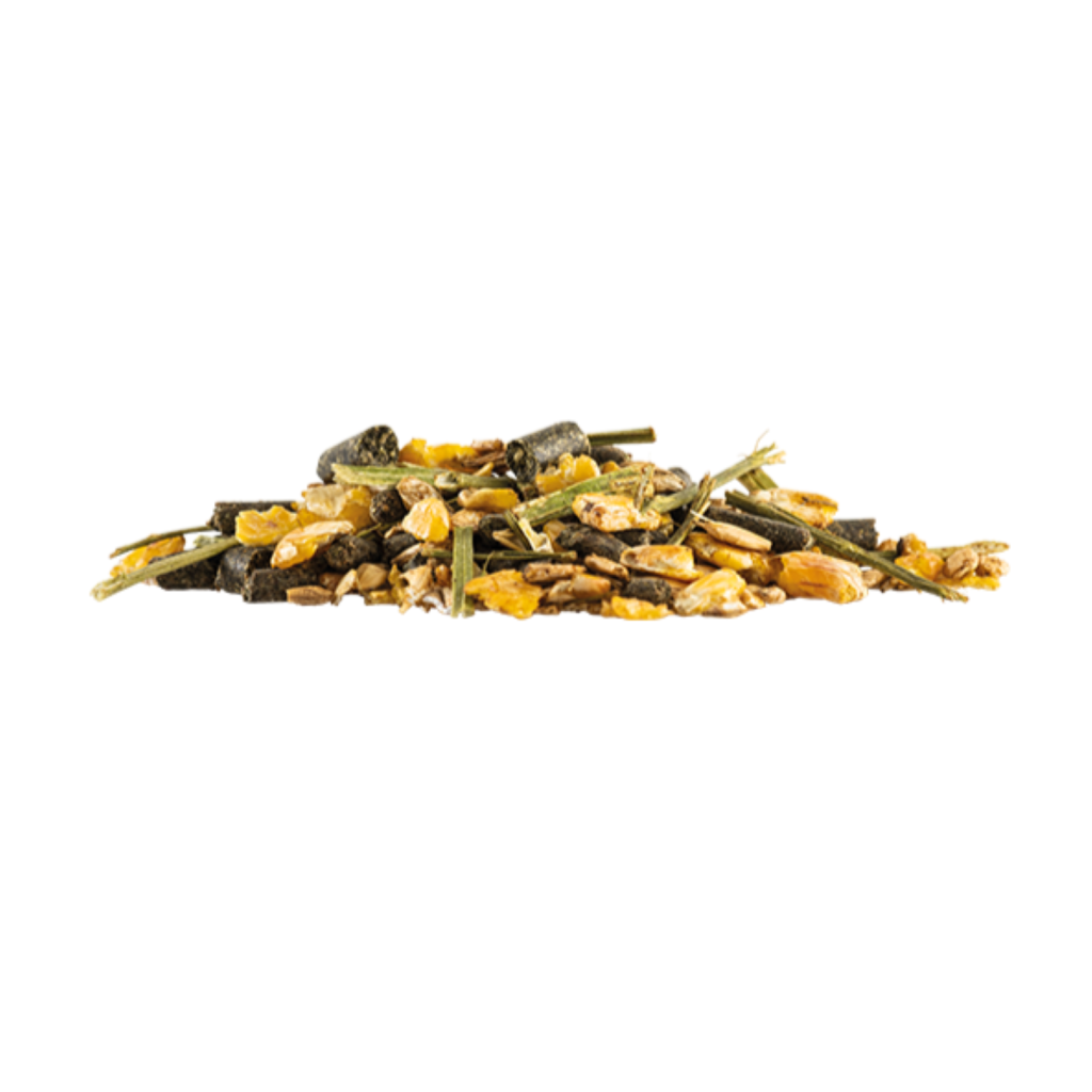 Maisflocken, aufgeschlossen (36%) • Gerstenflocken, aufgeschlossen (30%) • Gras-Grünmehl (13%) • Apfeltrester (10%) • Melasse (2,6%) • Luzerne, getrocknet & gehäckselt (2%) • Weizenkleie (2%) • Calciumcarbonat (1,3%) • Leinöl (1,1%) • Natriumchlorid (0,5%) • Pflanzenöl, raffiniert (0,5%) • Monocalciumphosphat (0,3%) • Magnesiumoxid (0,3%)