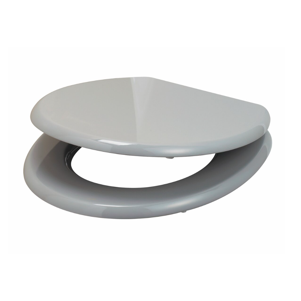 Silberfarbener Holzkern WC-Sitz mit Metallscharnier. Easy Clean, die glatte Oberfläche zur leichten Reinigung.