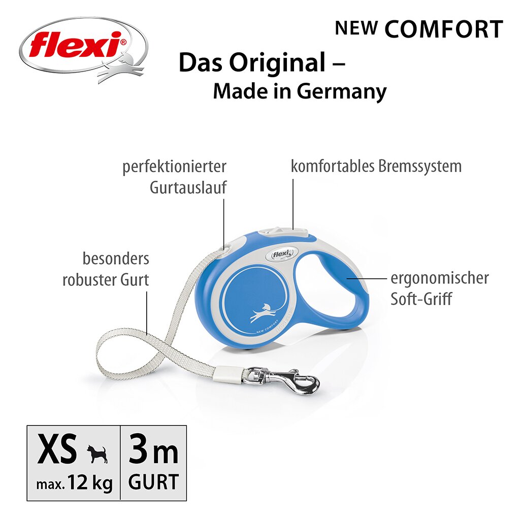 Die Gurt-Roll-Leine flexi New Comfort bietet Flexibilität, Komfort und Sicherheit und passt perfekt in jede Grundausstattung.